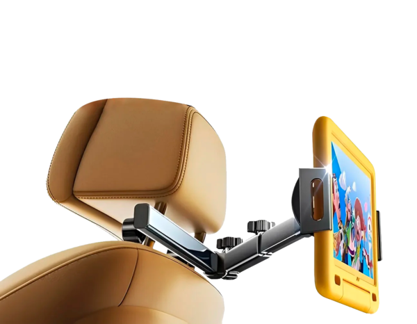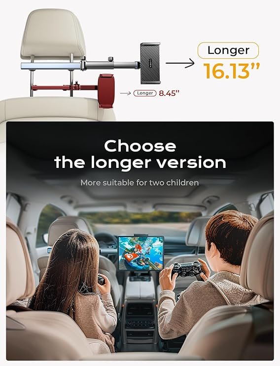 Brazo de actualización de tres ejes 2024 de extensión biaxial mejorado más largo y sólido: gira el soporte de tableta para el brazo del automóvil en diferentes ángulos lo que te permite cambiar la distancia de visión, puedes girar la tableta en el medio de dos asientos para que ambos pasajeros puedan mirar.